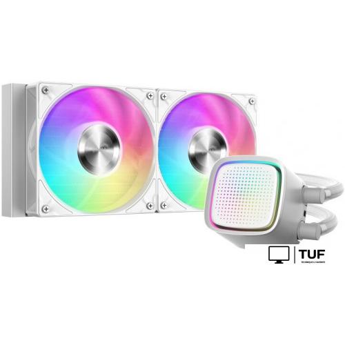 Система жидкостного охлаждения для процессора формата 240 мм оснащена алюминиевым радиатором размером 277x120x27 мм и двумя 120-мм вентиляторами с гидродинамическими подшипниками. Скорость вращения вентиляторов регулируется в диапазоне 800-2200 об/мин через 4-pin PWM, обеспечивая максимальный воздушный поток до 72.3 CFM. Совместимость с сокетами Intel LGA115X/1200/1700/1851 и AMD AM4/AM5 расширяет сферу применения.